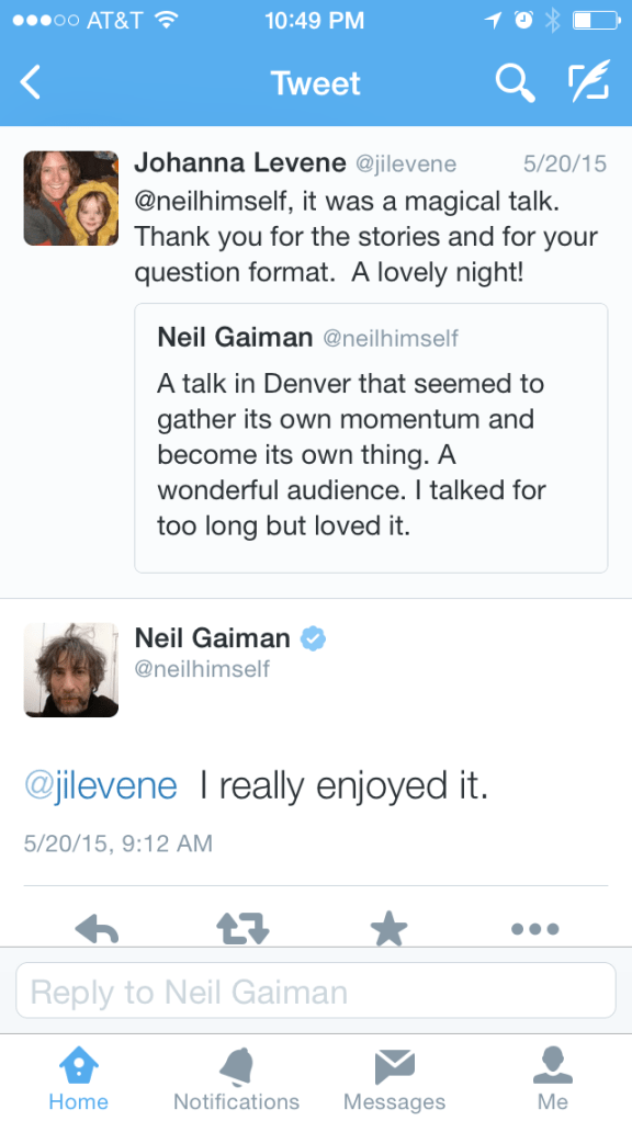 It’s been quiet on the Afthead blog lately, and for a very good reason. I’ve been writing elsewhere. I went to go see one of my top 10 favorite authors, Neil Gaiman, speak at an event called Pen and Podium. For two hours he told us stories of becoming a writer, read to us from his newest book of short stories, gave advice to aspiring writers, and answered questions from the audience. It was surreal to see him standing up in front of me.  Normally his melodic English accent emminates from the heat vents in my car while he narrates his audiobooks.  I took away four things: