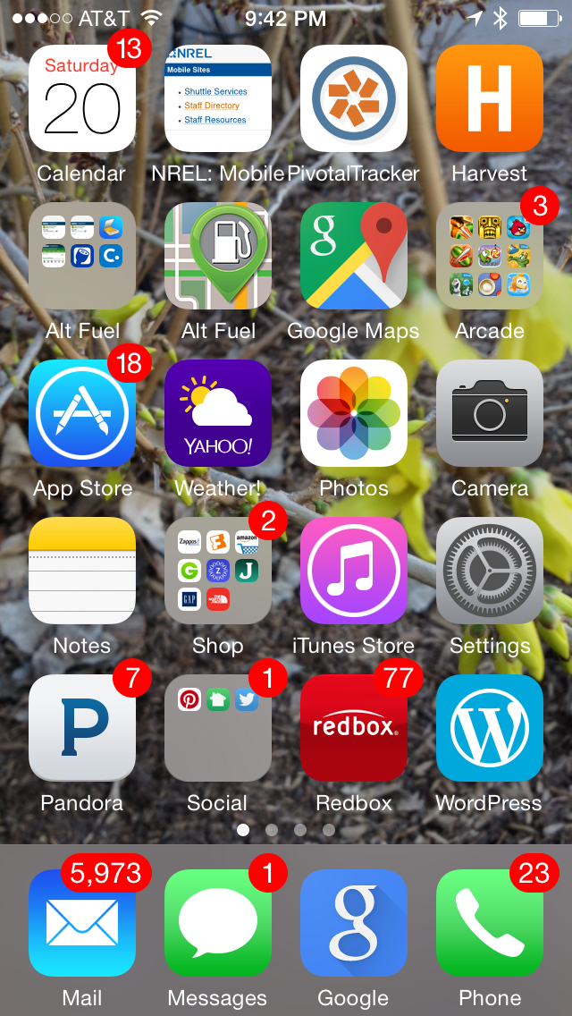 In case it isn’t obvious, I am in camp 1.  This is a screenshot of my phone.  I leave e-mails unread, voicemails unlistened to, I have no earthly idea what Redbox wants to tell me 77 times, and none of this bothers me.  My husband is in camp 2.  He has a sparkling clean, organized, empty inbox.  He clears up all those calendar items, whatever they are.  Mostly, our relationship is pretty symbiotic.  He deletes stuff he needs sometimes, but I can find that precious message in my heaps of electronic data.