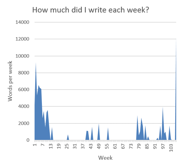 The novel took me 2 years and 18 days to finish. On average I wrote 132 words per day. Let’s marvel over that tiny number. 132 words per day can get you a long novel in just over 2 years. Of course that number is misleading.