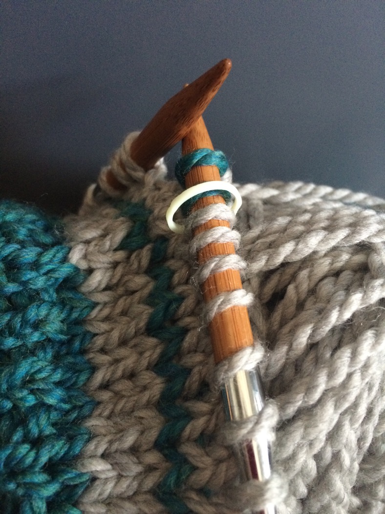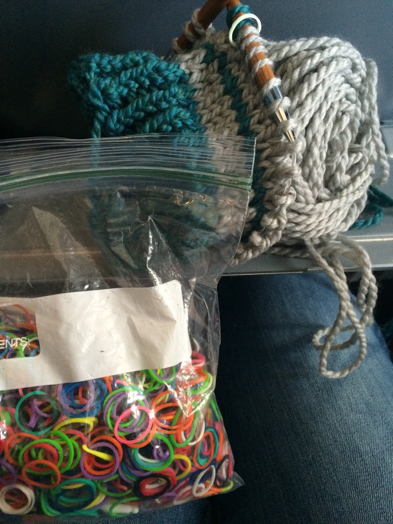 My daughter’s favored travel craft solved my most frequent issue: no stitch markers. It never fails that I cast on, start knitting in the round and ugh! No way to mark the beginning of the round. I can tie little yarn markers, but unless I have scissors or nail clippers I cannot cut my yarn. I usually don’t have those on the plane. Cue the tiny rubber band craft! My daughter loves traveling with a huge bag of them. She uses her fingers or a 4 prong loom to make huge ropes of rubber band weavings. Now the bands are not ideal markers. They are too sticky and can get trapped under stitches, but they are way better than nothing.