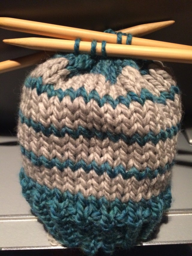 The best thing about knitting baby hats is that they are done in no time. Off to start hat #2, once I find a darning needle hack. I don’t think 10 month olds should wear hats attached to pointy sticks. Anyone have an idea to help?