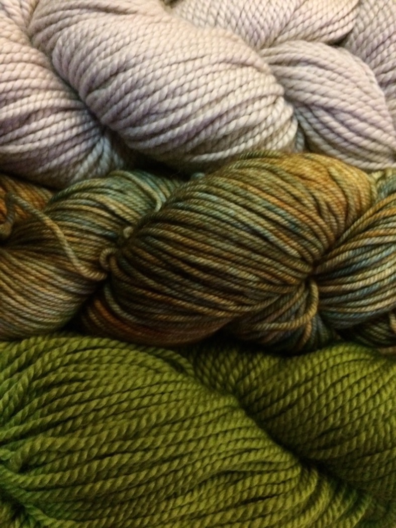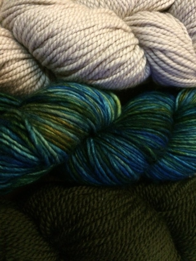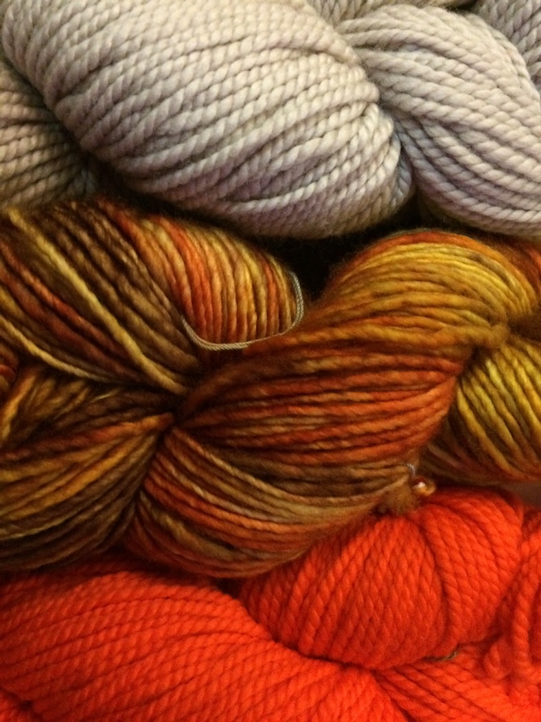 The neutral block is on the needles, and that color is a done deal, but I’m torn about the solid (equivalent of the yellow in the Purl Soho picture) and the variegated (the equivalent of the gold/maize in the Purl Soho picture). I’ve got three choices and would love to hear your thoughts about the relative beauty or not-beauty of each one. I love them all, but they are so different, and I really don’t want to make three cowls (because I’d have to buy six more skeins of the neutral color and that would be a lot of money and time and cowls.)