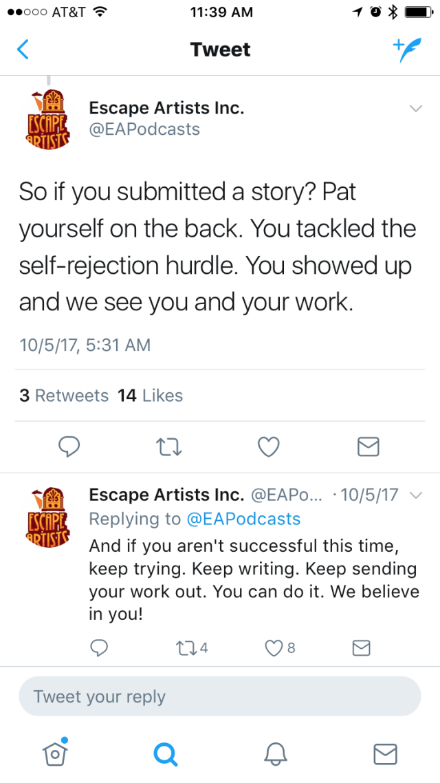 Then Twitter provided me with some really amazing facts, because you see, I follow PodCastle and their parent organization Escape Artists Inc. Here’s what I learned about the Artemis Rising submission process: