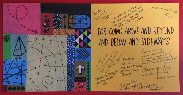 Then my team turned the tables on me, morphing the lunch into a celebration of me, complete with a card, gifts, and a heartfelt gratitude for all I do for the team. I was emotionally wrought and working off of four hours of sleep, so the fact that I did not break out in tears was a remarkable accomplishment. Compounding the emotion was that because of Tuesday, I finally understood an additional facet of what I provide to the team.