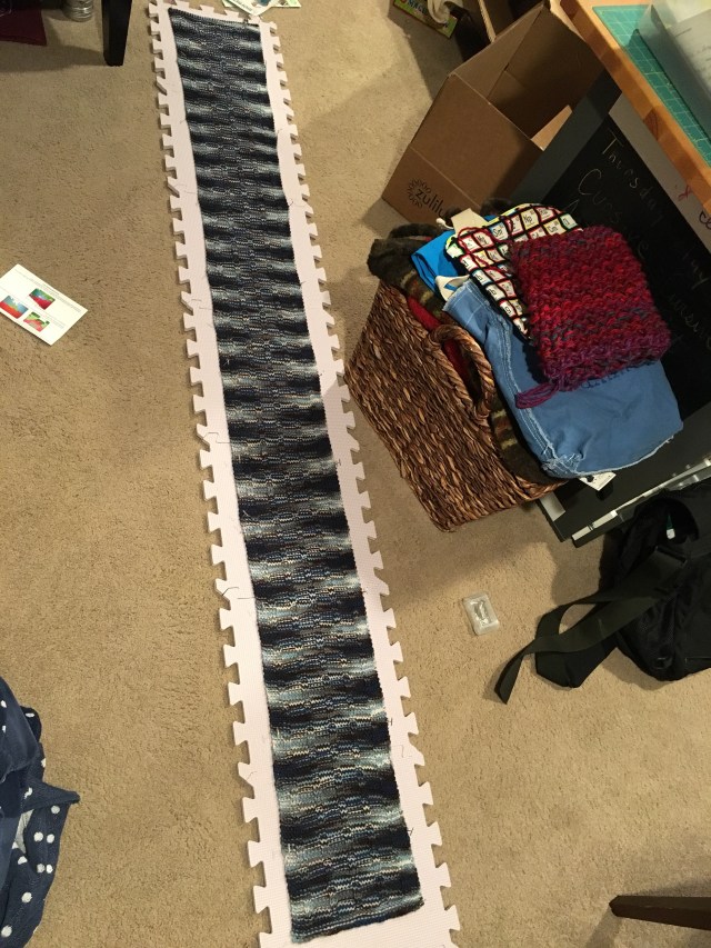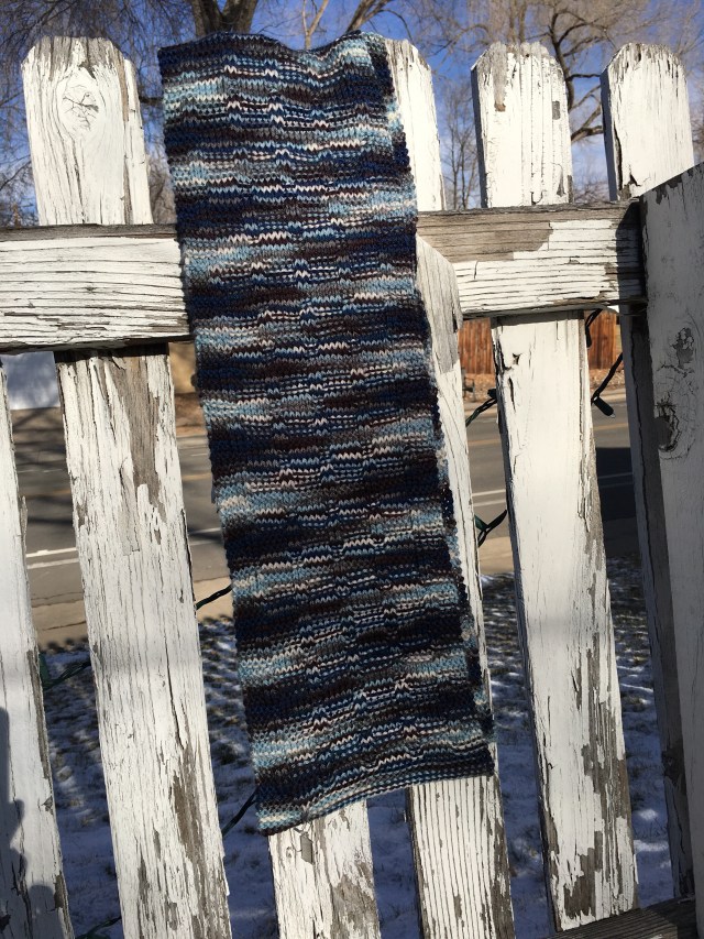 When knitting, I often miss the forest for the trees, so I was shocked when the blocked scarf revealed an unexpected cosmic sinusoidal wave. This miraculous pattern is enhanced by the fact that I joined two skeins of yarn mid-scarf, and as far as I can tell I accidentally did it perfectly. It’s not the multicolored scarf that was Tom Baker’s trademark, but the scarf feels very Doctor Who and “wibbly-wobbly timey-wimey”ish.