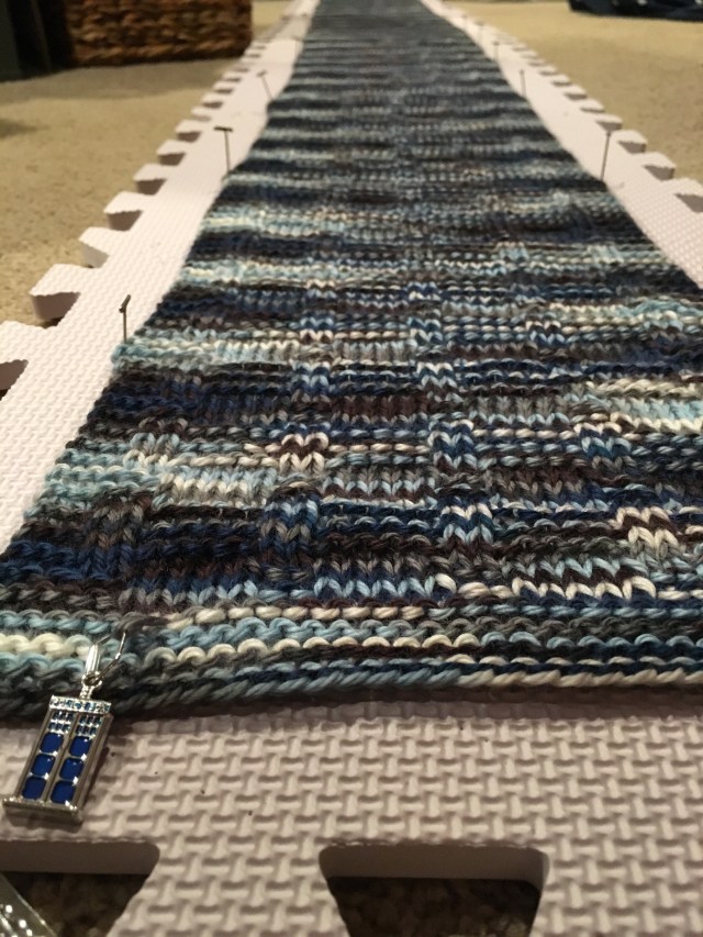 So when Jimmy Beans Wool and Lorna’s Laces released their limited edition Police Box yarn in March I started planning. I looked for patterns that looked like the Tardis–the magical police box in which Doctor Who travels the galaxy–and settled on the Blocks and Squares Scarf by Tetiana Otruta: a modified basket weave pattern with a nice border to keep the scarf from curling. To me, the pattern looked like the rectangles on the side of the Tardis.