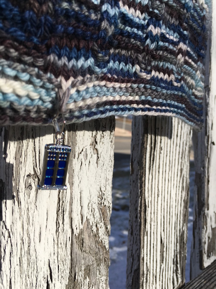 The scarf was further improved by the addition of a tiny Tardis charm, a stitch marker, also purchased from Jimmy Beans Wool, which was released the same time as the yarn. It’s subtle, yet ensures that the careful observer knows this is a scarf for a time traveler aficionado.