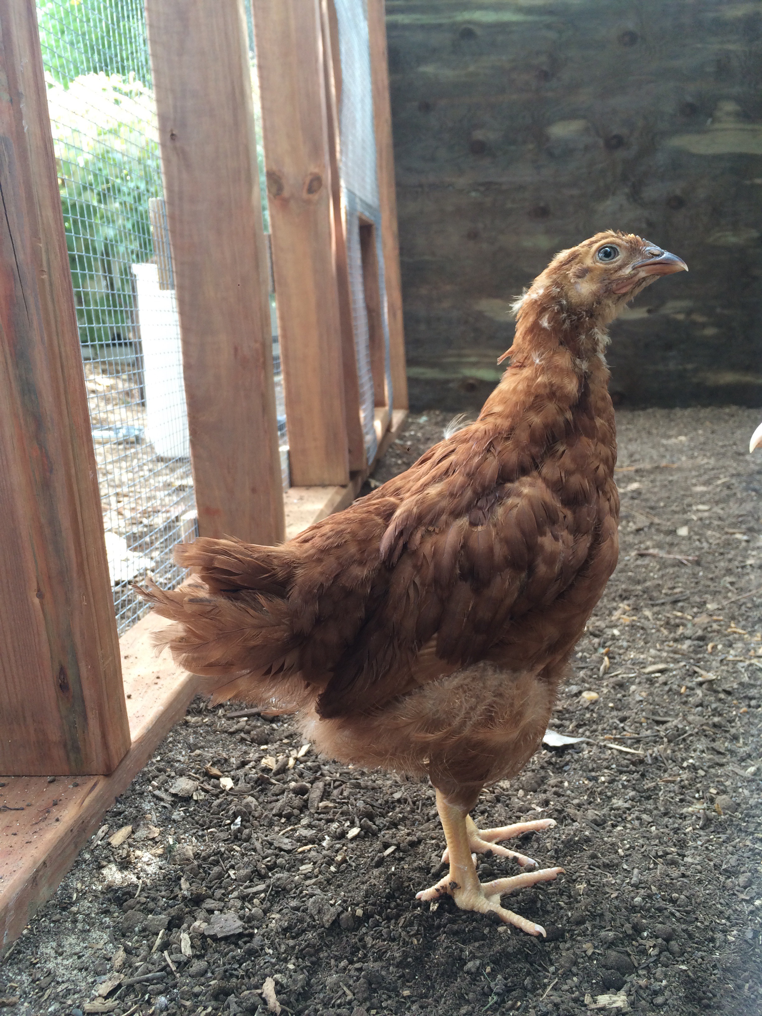 Finally we have Rosie, the littlest of the chickens. From the beginning she’s been the sweetest, the most friendly and, of course, was the one that almost got sick and died the first week. Yeah, we appear to attract sickly animals. After panicked googling, visiting feed stores, and syringe watering this little girl she’s now in great health. All that hands-on attention in those early weeks has made her brave, well socialized and willing to pose for pictures. “Who’s a pretty bird? You are Rosie!” Momma Afthead got to name this one, and I went for the obvious color-related name for this member of the Rhode Island Red breed.