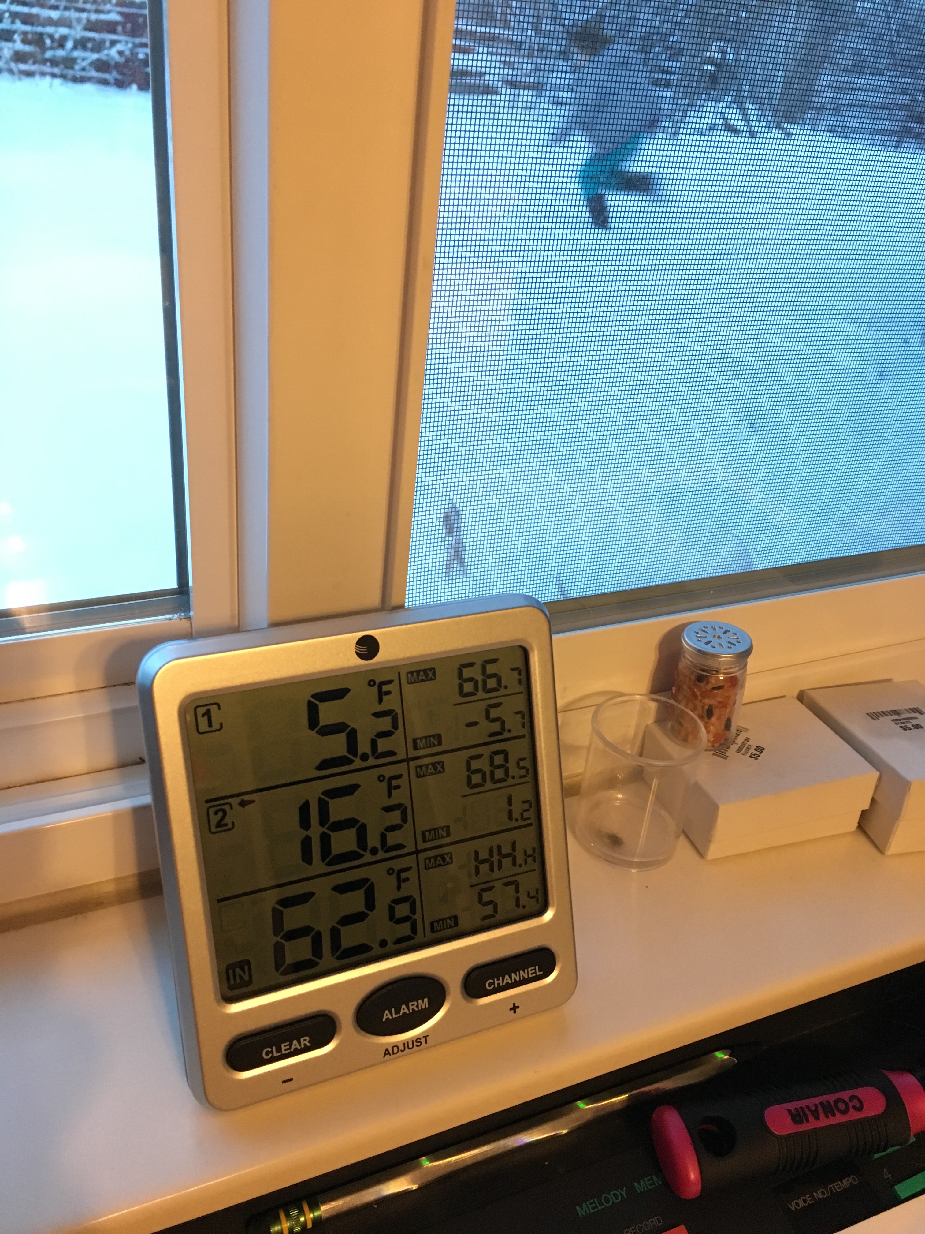 Let me tell you, we may have to patent these wonderful window blankets, because this past week the chicken coop was eleven degrees warmer than the outside when we had the heat lamp on and the window blankets attached. Without the window blankets the difference was 4 degrees. So the chickens are staying toastier thanks to my handiwork and my husband’s invention.