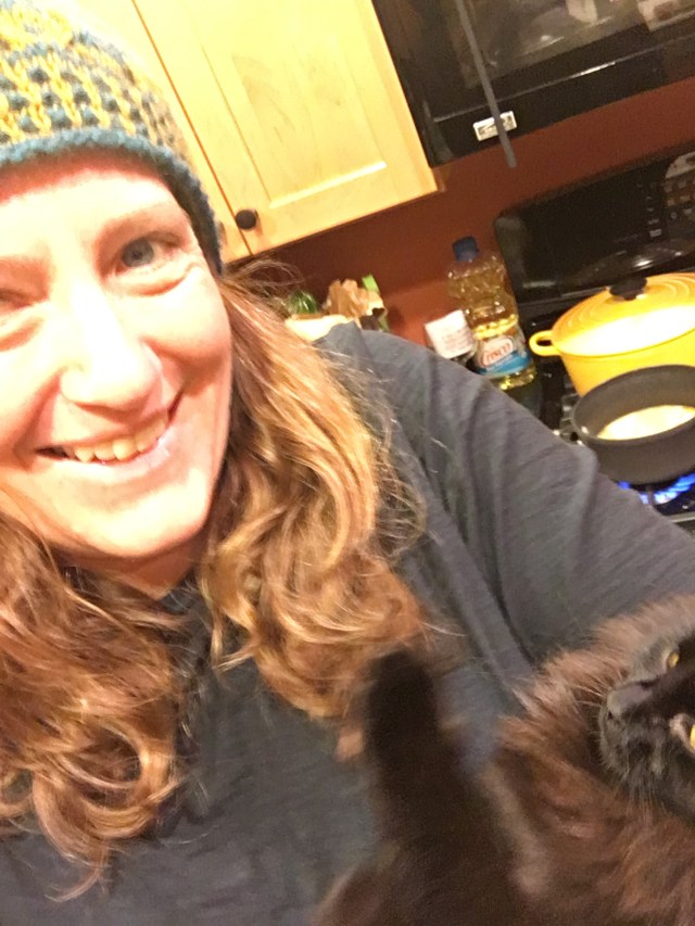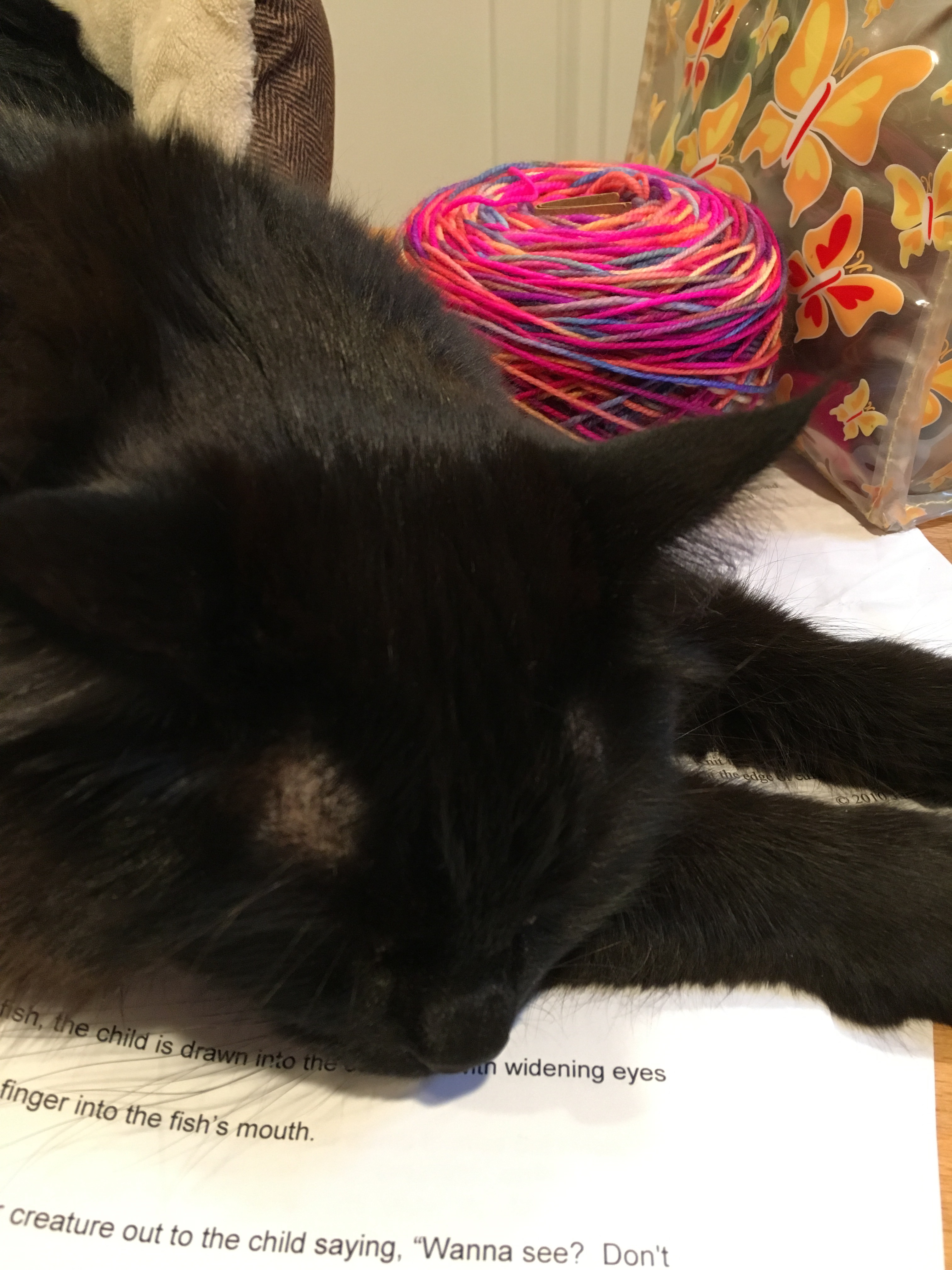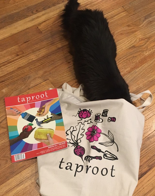 True enough. The short conversation proceeded a bit more normally after that, especially as it evolved to commerce. She told me about the delicious lunch she’d had, and I renewed my Taproot subscription – Amanda is the editor – and bought a copy of her new book which wasn’t officially released until yesterday. With the magazine renewal I got a free totebag, which doubles as a cat toy. (Note below cat is not the new kitten who got an emergency visit to the vet this weekend.)