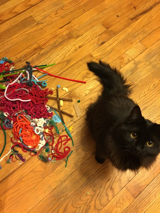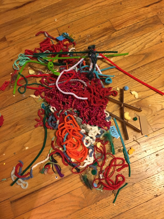 This is the one party every year when I don’t worry about what to wear, I don’t need a drink to loosen me up, and I don’t want to hide in my basement to recover. Cleaning up from the event I love the dustpan full of yarn bits and googly eyes. My daughter, having helped and chatted with her friends, starts her projects in earnest when everyone leaves. She’s watched her friends and picked her favorite ideas to make over and over. My extroverted daughter and her introverted momma are both energized when the evening comes to a close.