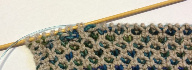 Can you see the mistake? The place where the pattern goes awry starting at the fourth stitch from the last one on the needle? Here, I’ll show you a close up too. This is not a good situation.