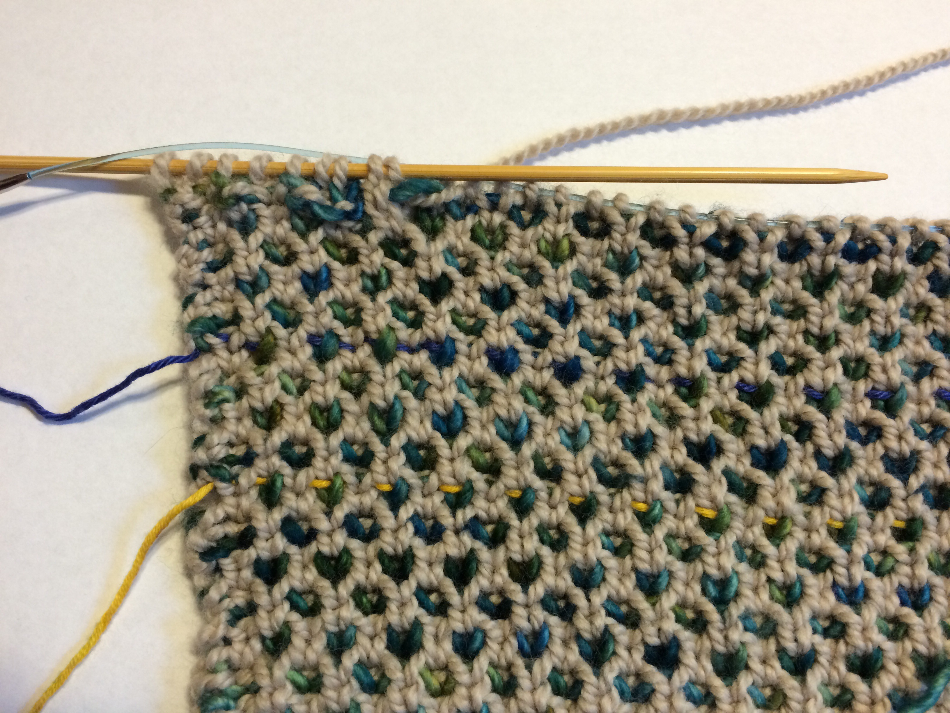 - Some needles – not mine – actually have little holes in the needle which allow you to thread waste yarn into the hole before you start the last row of the repeat, and as you knit the waste yarn will automatically be pulled through the stitches. Sounds cool, but not possible with the tools I have.