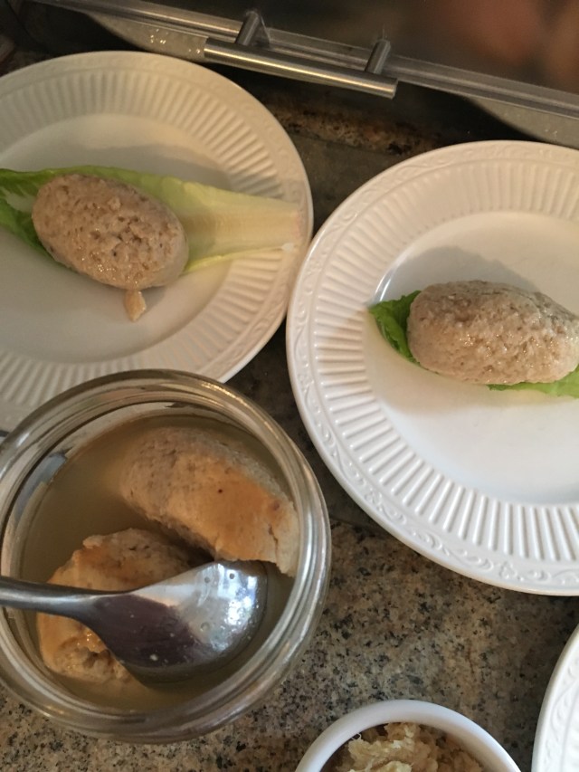 Feeling moderately comfortable at the table the first course of the actual meal was served: gefilte fish.  Someone set in front of me an albino patty with gelatinous quivering globules glistening on its surface cradled on a bed of lettuce.  All around me strangers I wanted to impress covered their helpings with fluorescent pink horseradish and dug in with apparent glee. Here in front of me was the nightmare of my childhood and I had two choices: be “that disrespectful new girl” and shun this foreign food or face my fear and try a bite.  There was not an option to run screaming from the room.  This was before the days of smartphones so I couldn’t snap a picture and send it to my mom with an eww, like I did for this blog post.  I had to put on my big girl shoes and face my fears if I wanted to be respectful.  I don’t think I made it through half of the fish and I know I drank an entire tumbler of water but I ate enough to not make a scene.  The rest of the meal followed without incident.