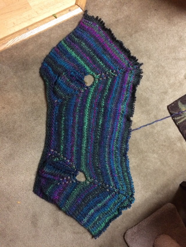 High in the dark corner of a closet is the sweater yarn protected by five gallon Ziploc bags. In these giants of the sandwich bag world lurk yarn quantities large enough to cover an adult torso in stitches. There are two, or three, okay maybe five such bags on the top shelf. On the bottom shelf? An opaque Rubbermaid container of blanket yarn: quantities similar to sweater yarn, but with more color variation.